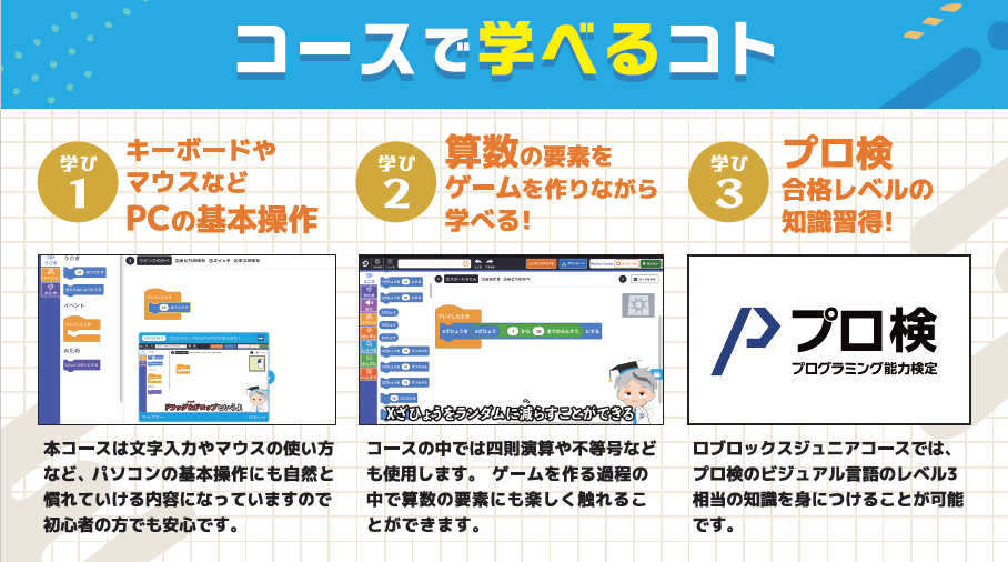 ジュニアコースでプログラミングの土台づくりをはじめて、次にロブロックスコースにステップアップできます。